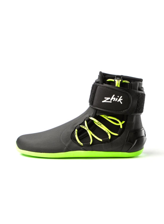 An evolution of the original and best-selling Zhik dinghy boot the latest high cut boot is a true realisation of everything Zhik has learnt from working with some of the world’s greatest sailors. An identity is imparted using a high grip non-marking flouro yellow sole and lacing while the moulded upper, heel cup and oversized ankle strap provide excellent support during periods of high activity. Improvements over the original include a quick lock lacing system, low profile ankle strap, reinforced mid sole and improved shape for a firmer and closer fit that minimises chafing and provides even more support. The 2mm neoprene construction combined with the lacing system allow the boot to work through all seasons as the fit of the entire boot can be tailored to a neoprene sock however, being 2mm this boot is lighter weight and has a slimmed down sole (without reducing tread depth) to maximise feedback and connect you more directly to the boat.